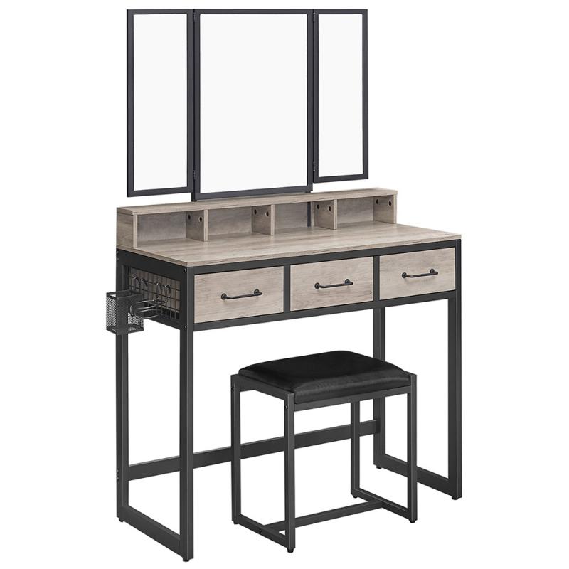 Toaletna mizica Albinia Fontana bo v vsak dom prinesla stil. Ima 3 predalov, ki nudijo veliko prostora za vašo kozmetiko in dodatke, tri ogledala, ki vam pomagajo opaziti vsako podrobnost in oblazinjeni tabure za dodatno udobje pri ličenju • Toaletna mizica z ogledalom, 3 predali in stolček črne barve • mere: 90 x 40 x 141 cm • barva: siva, črna