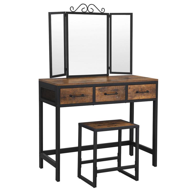 Modra ženska ve, da potrebuje kozmetiko, nakit in parfum na enem mestu. Manj iskanja in več časa za lepotičenje. Ta elegantna toaletna mizica je s petimi predali idealna za vse vaše potrebe. • Toaletna mizica s 3 ogledali, 3 predali in rjavim taburejem • mere: 90 x 40 x 137.5 cm • barva: rjava, črna