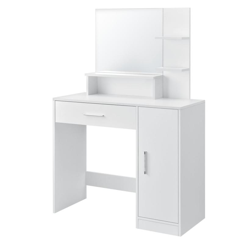 Pametna ženska ve, da potrebuje vse ličila, nakit in parfume na enem mestu. Naj bodo pri roki, da ne boste izgubljali časa z iskanjem in pridobite tako več časa za ličenje. Ta elegantna toaletna mizica z dvema policama in predalom, v kateri pospravite vse, kar potrebujete, bo vašim šminkam zagotovila popolno mesto. • Toaletna mizica z 1 predalom, 2 policami in ogledalom • mere mizice: 90 x 38 x 137 cm • mere ogledala: 45 x 50 cm • barva: bela