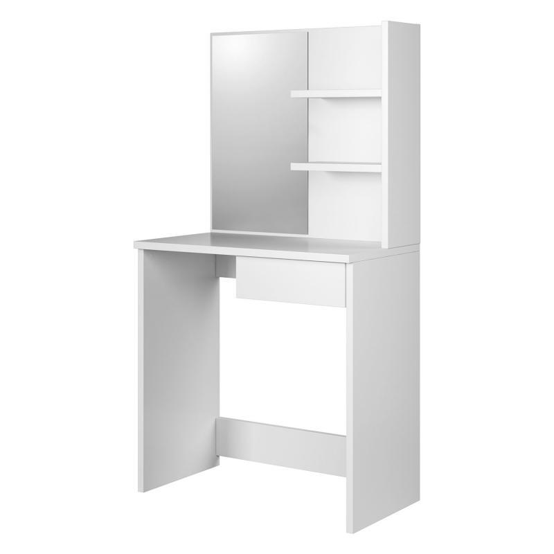 Toaletna mizica Victorine Meurent minimalističnih prvin vam pričara prostor, ki bo samo vaš. V njem lahko svobodno odkrivate svoje čare in poudarite svojo lepoto, saj ima mizica veliko ogledalo, tri police ter predal. • Toaletna mizica, 2 polici, predal in ogledalo • mere mizice: 74,5 x 40 x 139,5 cm • mere ogledala: 64 x 36 cm • barva: bela