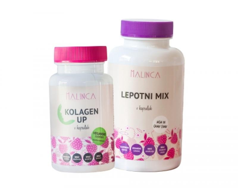 Paket vsebuje Lepotni mix v kapsulah in Kolagen UP. Naraven način za lepe lase. nohte in kožo ter sijoč in mladosten videz.