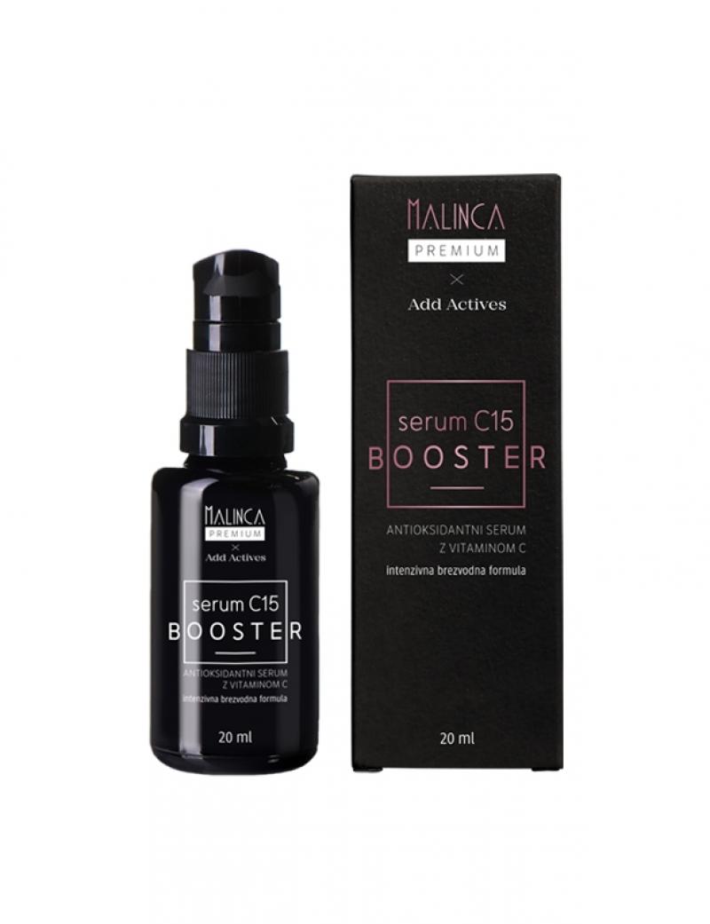 Serum C15 Booster je vrhunski antioksidantni serum za anti-age nego obraza z naprednim vitaminom C. ki je nastal v sodelovanju Malince s priznano znamko kozmetike Add Actives. Združuje moč inovativnega. nekislega in nedražečega vitamina C z izrednimi in redkimi antioksidanti. ujetimi v brezvodno formulo.