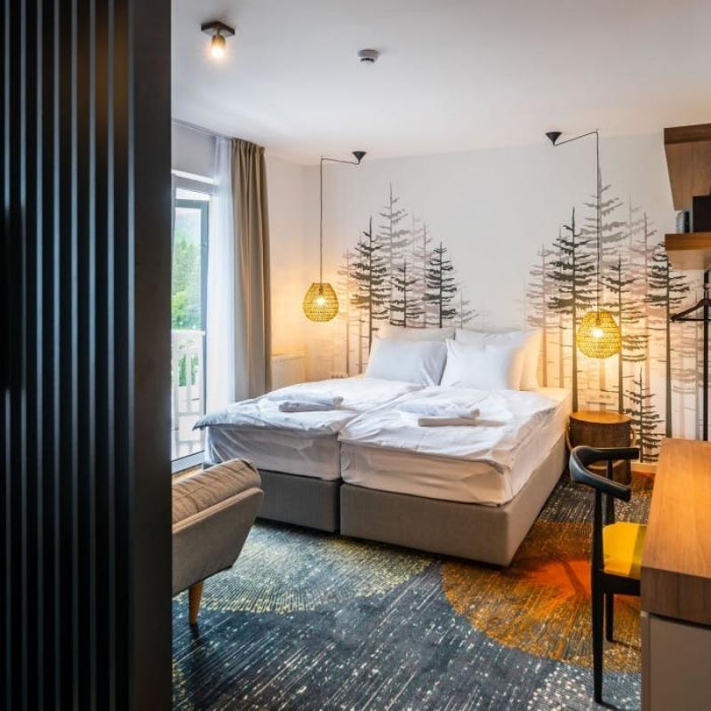 Družinska soba Deluxe: 33 m2, balkon, pogled na jezero; popolnoma prenovljene, moderne sobe in suite so ogledalo narave, ki jih obdaja. Ne glede na to, ali prihajate na počitnice ali poslovno, posebej zasnovane sobe ponujajo vse, kar potrebujete za počitek in sprostitev.