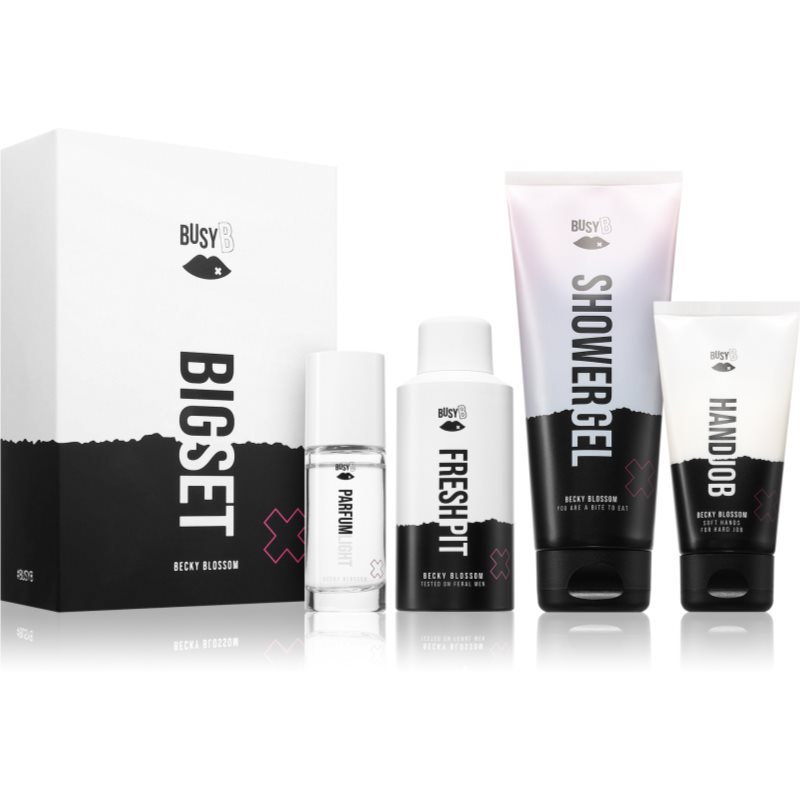 BusyB Becky Blossom BigSet, 1 kos, Toaletne vode za ženske, Razveselite sebe ali svoje bližnje s popolnim kozmetičnim setom BusyB Becky Blossom. Vsebina seta: BusyB Parfum Light Becky Blossom toaletna voda 30 ml BusyB Hand Job krema za roke 75 ml BusyB Fresh Pit Becky Blossom antiperspirant 150 ml BusyB Becky Blossom gel za prhanje 230 ml Lastnosti: mešanica kozmetičnih izdelkov za vsakodnevno uporabo odličen za darilo razveselil bo vsako žensko cvetlična dišava dišava, primerna za vsakodnevno uporabo Navodilo za uporabo: Vsak izdelek iz kozmetičnega seta uporabljajte v skladu z navodilom.