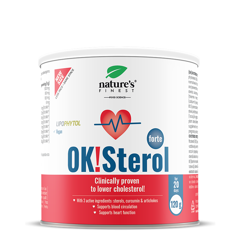 OK Sterol Forte je močan 6-v-1 prehranski dodatek za holesterol in srčno dobro počutje, ki združuje rastlinske sterole Lipophytol, kurkumo, izvleček artičoke in popoln B-kompleks za celovito podporo srčno-žilnemu sistemu. Rastlinski steroli pomagajo vzdrževati normalno raven holesterola v krvi, zaradi česar so dragocen del življenjskega sloga, ki podpira srce. Kurkuma v prahu in izvleček kurkume (Curcuma longa) zagotavljata antioksidativno in presnovno podporo, medtem ko se izvleček artičoke (Cynara scolymus L.) tradicionalno uporablja za podporo delovanju jeter, prebavi maščob in vzdrževanju zdravih ravni krvnih lipidov.Vključena B-vitamini (B1, B2, B3, B5, B6, B9, B12) prispevajo k normalni presnovi energije, podpirajo živčni sistem in pomagajo zmanjševati utrujenost ter izčrpanost, s čimer prispevajo k vsakodnevni vitalnosti in zdravju srca. Z blagim okusom po limoni in sladkanjem s stevio OK Sterol Forte ponuja priročen način podpore upravljanju holesterola, normalnim ravnem krvnih lipidov, cirkulaciji in splošnemu srčno-žilnemu dobremu počutju. Idealen je za odrasle, ki iščejo naraven, rastlinskega izvora pristop k vzdrževanju zdrave ravni holesterola kot del uravnotežene prehrane in aktivnega načina življenja.