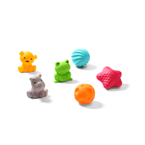 Senzorične igrače so kombinacija igrače in izobraževalnega orodja. Pomagajo izboljšati koordinacijo rok in oči ter spodbujajo razvoj otrokovih čutil. Komplet vsebuje 3 kroglice in 3 živali. Vsaka senzorična igrača ima drugačno barvo in teksturo. Uporabljajo se ne le za igro in spodbujanje radovednosti, ampak so odlični tudi za nežno masažo. Otrok jih lahko žveči med izraščanjem zob. Narejen je iz higienskega silikona. Senzorične igrače so na voljo v praktični vrečki za prenašanje ali shranjevanje.Razvoj finih motoričnih spretnostiČutne žogice so na voljo v različnih velikostih in oblikah, ki otroku pomagajo vaditi prijemanje in natančne gibe prstov. Različne teksture spodbujajo čutne receptorje.Vizualno zanimivoPisane žogice zlahka pritegnejo otrokovo pozornost, spodbujajo njegov vid in radovednost glede sveta okoli njih.SafeŽogice so idealne za igro in vadbo koordinacije. Z metanjem in lovljenjem otrok razvija spretnost.Olajšanje pri izraščanju zobSenzorične žogice zaradi svoje teksture in mehkobe otroku olajšajo boleče izraščanje zob.Idealno za masažoŽogice lahko uporabljate za sproščujočo masažo trebuha, hrbta in stopal za otroke in odrasle. Masaža pomirja in sprošča napete mišice. Spodbuja sprostitev in pomaga zaspati.Torba za prenašanje z ročajiPaket vključuje vrečko za priročno prenašanje in shranjevanje senzoričnih kroglic.Tehnične lastnostiMaterial: silikonStarost otroka: 6 m+Pred prvo uporabo izdelek sterilizirajte z vrelo vodo (ne zavrite!) in posušite. Za vsakodnevno čiščenje priporočamo pranje v topli vodi z dodatkom otroškega mila. Po pranju ga temeljito sperite in posušite.Z igrače odstranite vse varnostne elemente, ki bi lahko bili nevarni za otroka.Preverite kakovost igrače, preden jo daste otroku. Le nepoškodovana igrača zagotavlja varno uporabo za vašega otroka. Igračo zavrzite takoj, ko opazite prve znake poškodb.Igranje je priporočljivo pod nadzorom odraslih.Igrača ustreza standardu EN 71.Priporočamo, da embalažo shranite za primerjavo. Embalažo hranite zunaj dosega otrok. Embalaža in pritrdilni elementi niso igrača in lahko predstavljajo nevarnost za zdravje otroka.Naslov dobavitelja: Babyono sp. z o.o., Kowalewicka 13, 60-002 Poznań, Poljska. +48 61 83 90 520, info@babyono.pl, www.babyono.com