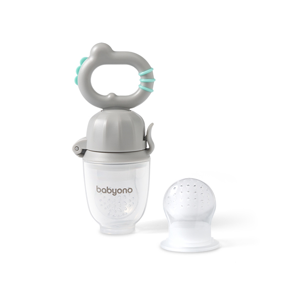 Silikonski hranilnik je nepogrešljiv pripomoček za dojenčke in malčke, ki se učijo uživati otroško hrano. Odlična je za razširitev otrokove prehrane in spodbujanje k preizkušanju novih dobrot. S pomočjo dude lahko otroka varno hranite s svežo zelenjavo, sadjem in drugo hrano. Zelo trpežen silikon je enostaven za čiščenje in varen za žvečenje, zato ni nevarnosti zadušitve. Poleg tega bo pomiril otrokove dlesni med izraščanjem zob in zagotovil olajšanje. Zaradi kompaktne velikosti lahko hranilnik vzamete kamor koli s seboj, udoben ročaj pa bo vašega otroka spodbudil, da se bo hranil sam.Raznolikost otrokove prehrane:Z uvajanjem sadja in zelenjave otrok spoznava različne okuse in teksture ter razvija zdrave prehranjevalne navade. S silikonskim hranilnikom se otrok ne bo zadušil, ko bo poskusil novo trdno hrano.Vijačni mehanizemOblika omogoča, da hrano lažje stisnete in jo približate otrokovim ustom. Varno lahko nadzorujete količino in razpoložljivost živil, ki jih poskuša vaš otrok.Olajšanje pri izraščanju zobKo otroku izraščajo zobje, so njegove dlesni lahko zelo občutljive. Mehak silikonski podajalnik bo pomagal ublažiti bolečine pri izraščanju zob.Pameten dizajnUdoben ročaj se odlično prilega drobnim otroškim rokam in spodbuja otroka k samostojnemu hranjenju. Ta priročna rešitev vam omogoča, da otroka hranite kjer koli in kadar koli.Varno in enostavno čiščenjeHranilnik ne vsebuje BPA. Zahvaljujoč prefinjeni zasnovi je izdelek enostavno vzdrževati v čistoči. Napajalnik lahko preprosto razkužite z vrelo vodo ali pa ga samo sperite v vodi.Dve velikosti dudePaket vsebuje dve velikosti dude (6 in 12 mesecev), da izdelek prilagodite starosti in znanju otroka.Pokrijte z lestvicoPrevleka z lestvico je praktična rešitev, s katero lahko hitro in priročno nadzorujete količino hrane, ki jo ponujate otroku, in ohranjate silikonsko dudo čisto.Tehnične lastnostiMaterial silikon + PPDimenzije: 5 x 16 cmOdstranite vse varnostne elemente, ki bi lahko bili nevarni za otroka.Izdelek je treba preveriti pred vsako uporabo. Ob prvih znakih poškodb ali obrabe ga zavrzite.Vedno uporabljajte pod nadzorom odrasle osebe.Izdelek ni igrača.Priporočamo, da embalažo shranite za primerjavo. Embalažo hranite zunaj dosega otrok.Pred prvo uporabo izdelek sperite z vročo vodo (ne zavrite!) in ga posušite.Če izdelek pomivate v pomivalnem stroju, ga po končanem programu takoj odstranite in posušite. Če izdelek po pranju pustite v pomivalnem stroju, lahko pride do deformacij.Naslov dobavitelja: Babyono sp. z o.o., Kowalewicka 13, 60-002 Poznań, Poljska. +48 61 83 90 520, info@babyono.pl, www.babyono.com