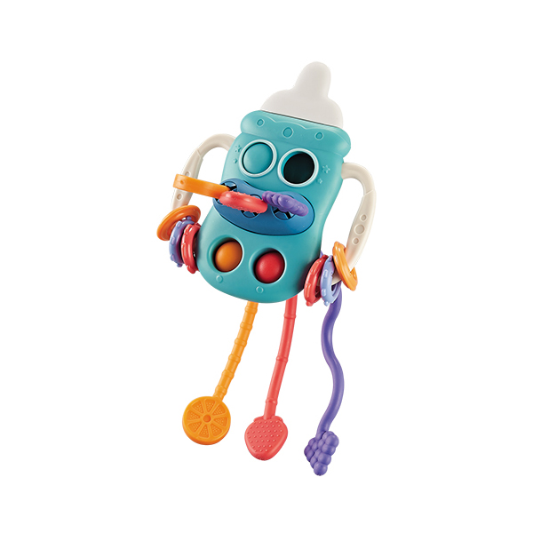 Senzorična igrača Bottle je večnamenska senzorična igrača, zasnovana za podporo splošni rasti vašega otroka. Spodbuja razvoj njegovih motoričnih sposobnosti, izboljšuje gibljivost in koordinacijo majhnih prstkov. Igrača je sestavljena iz različnih kosov, izdelanih iz varnega silikona in trpežnih materialov. Otrok lahko igračo stiska, potiska, vleče in premika. To otroka spodbuja, da je aktiven in kreativen ter raziskuje svet. Igrača je na voljo v živahnih in kontrastnih barvah, ki pritegnejo otrokovo pozornost in mu pomagajo pri učenju razlikovanja med barvami in oblikami.Lastnosti:Večfunkcionalnost- Igrača lahko aktivno podpira senzorični razvoj otroka. Na voljo je z ropotajočimi deli, interaktivnimi gumbi in silikonskimi vrvicami z mehkim zaključkom.Grizalo- Grizalo v obliki dude je izdelano iz visokokakovostnega silikona. Zaradi njene mehke in varne strukture lahko dojenček ublaži bolečino dlesni ob rasti prvih zobkov.Pop in gumbi- Pop in gumbi, ki se premikajo in stiskajo, izboljšujejo ročne spretnosti ter koordinacijo oči in rok.Praktičnost in varnost- Igrača je bila zasnovana z mislijo na varnost. Vsi uporabljeni materiali so nestrupeni in brez BPA.Razvoj motoričnih sposobnosti- Oblika, velikost in teža so bile skrbno prilagojene, da popolnoma ustrezajo ročnim potrebam dojenčka.Dimenzije izdelka: 11 cm x 10 cmPriporočena starost: 18m+Z igrače odstranite vse varnostne elemente, ki bi lahko bili nevarni za otroka.Preverite kakovost igrače, preden jo daste otroku. Le nepoškodovana igrača zagotavlja varno uporabo za vašega otroka. Igračo zavrzite takoj, ko opazite prve znake poškodb.Igranje je priporočljivo pod nadzorom odraslih.Igrača ustreza standardu EN 71.Priporočamo, da embalažo shranite za primerjavo.Embalažo hranite zunaj dosega otrok.Embalaža in pritrdilni elementi niso igrača in lahko predstavljajo nevarnost za zdravje otrokaNaslov dobavitelja: Babyono sp. z o.o., Kowalewicka 13, 60-002 Poznań, Poljska. +48 61 83 90 520, info@babyono.pl, www.babyono.com