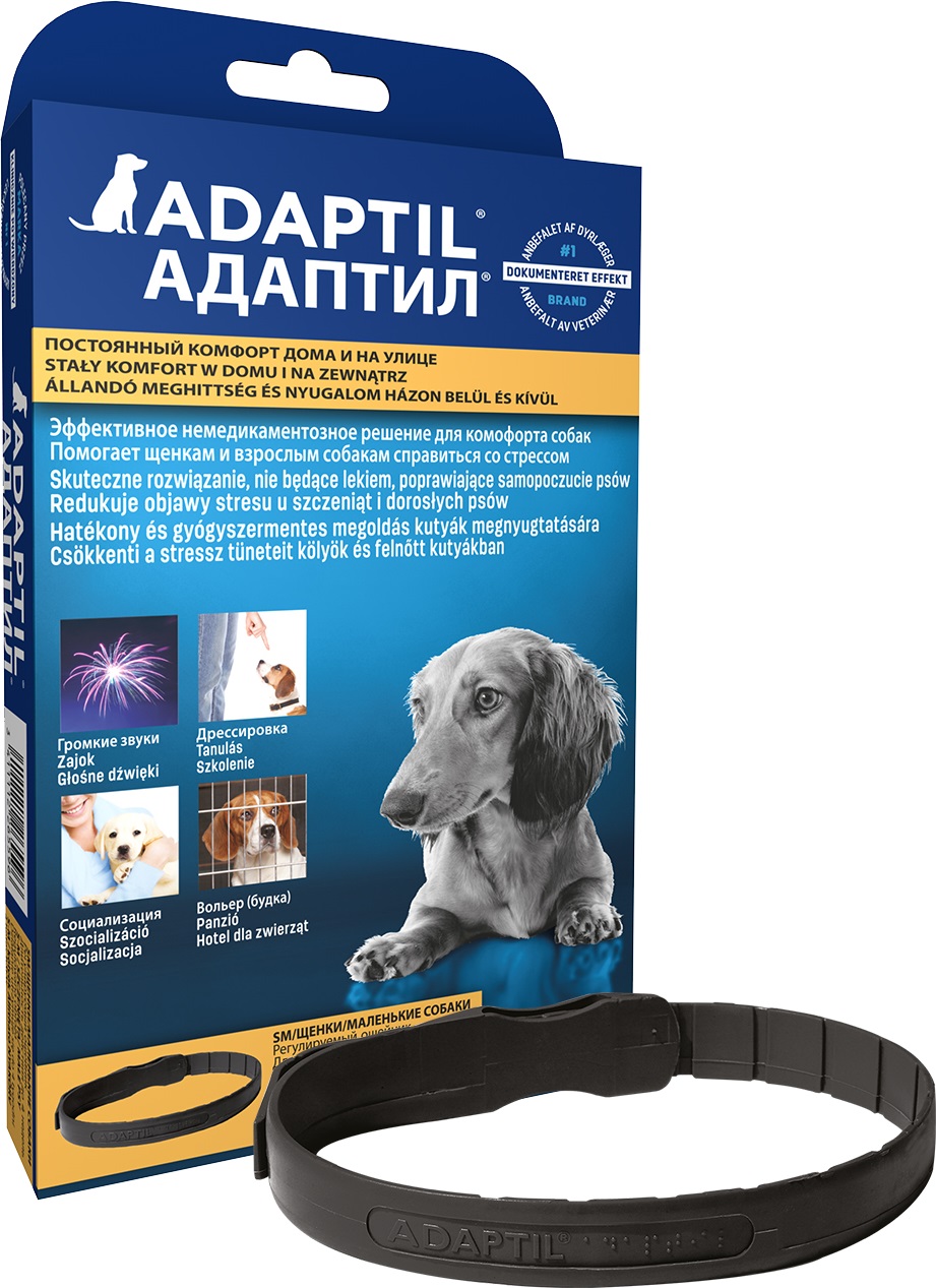 Lastnosti: - Uporaba ovratnice ADAPTIL je enostavna, udobna in zagotavlja vašemu psu stalen feromonski učinek tudi, ko je na prostem. - Ovratnica je idealna rešitev: za socializacijo kužka, potovanje, internat ali celo pasjo šolo. Ovratnica je na voljo v dveh velikostih in cca. Deluje 4 tedne. - ADAPTIL pomaga psom pri soočanju s stresom novih izkušenj in strahu. Takšna npr. obdobje socializacije mladička, grmenje in drugi glasni zvoki (npr. ognjemet), posvojitev, selitev, potovanje ali prihod novega družinskega člana. - Ko psička mati skoti. pes oddaja za svoje mladičke pomirjujoč feromon, ki ga človek ne zazna. Ta feromon nosi sporočilo varnosti in pomirjenosti za otroka v situaciji, ko je tik pred raziskovanjem zahtevnega sveta okoli sebe. ADAPTIL je sintetična kopija tega feromona. ADAPTIL za mladiče in odrasle pse klinično dokazano zmanjšuje stres, ki sicer lahko povzroči neželeno vedenje in pomaga pri učenju. - Izdelek je na trgu že 15 let, testiran je bil na 5 milijonih psov, njegova učinkovitost pa je podprta z 28 znanstvenimi publikacijami. - ADAPTIL ni pomirjevalo ali opojno sredstvo. Je vrstno specifična, kar pomeni, da jo lahko zaznajo le psi. Sestava: - Analog feromona za pomiritev psov: 5% - Nosilec q.s. 1 ovratnica: 100% Velikosti: - Ovratnica za kužka in manjšega psa - 46,5 cm (maksimalni obseg vratu 37,5 cm) - Srednja in velika pasja ovratnica - 70 cm (največji obseg vratu 62,5 cm)