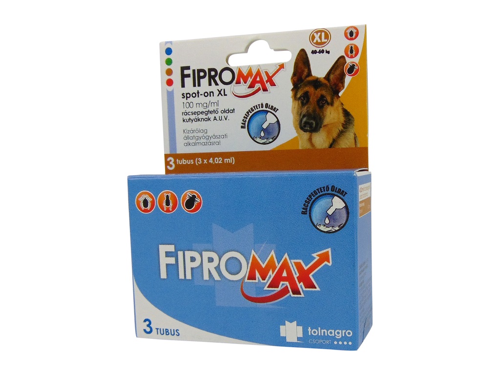 1, Ime Veterinarskega Farmacevtskega pripravka: - Fipromax Spot-On XL 100 mg/ml raztopina za pse A.U.V. 2, Opis aktivne sestavine in pomožne snovi: Aktivne sestavine: - Fipronil: 402,0 mg Pomožne snovi: - Butil-hidroxianizol: 0,804 mg- Butil-hidroxitouol: 0,402 mg - Etanol: 0,402 ml 3, Indikacije: Sredstvo za zdravljenje in preprečevanje okužbe bolham in klopom. Sredstvo je primeren tudi za zaščito proti ušim, plenilskim pršicam ter za preprečevanje in zdravljenje dermatitisa, ki povzročajo bolhe. Pomaga pri boju proti okužbam, ki jih povzročajo pršice. Učinkovito proti Lyme vektor bolezni, na Ixodes ricinus. 4, Protii indikacije: - na mladičih pod 8 tednov starosti in/ali na mladičih ki imajo manj kot 2 kg-ov je prepovedana uporaba izdelka! - Ne sme se uporabiti na bolanem živalim (ki trpijo v sistemski bolezeni, vročini) oz. na okrevanim živalim! - PREPOVEDANA uporaba na zajcih, ker lahko povzroči resne neželene učinke in lahko pride do njihove smrti!- Ta izdelke so ustvarili samo za pse. Prepovedana uporaba na mačkah zaradi prevelikega odmerka! 5, Stranski učinki: Če pes sredstvo poliže, za kratek čas se lahko pojavi slinjenje, ki je največkrat zaradi glavnega sredstva. V redkih primerih, na mestu aplikacije se lahko pojavi občasno draženje kože (razbarvanje kože, izpadanje dlake, srbenje, rdečina). Izjemoma, slinjenje, prehodni nevrološki simptomi (hiperestezija, depresija), srbenje, odpad dlake, bruhanje in težave dihanja. Prevelikega odmerka proizvoda se je treba izogibati. Če opazite kakršne koli resne stranske učinke ali druge učinke, ki niso navedeni v tem navodilu, obvestite svojega veterinarja! 6, Ciljne vrste živali: Pes 7, Odmerek, način (i) uporabe po ciljnih živalih: Najmanjši priporočeni odmerek 6,7 mg fipronil/ttkg, torej Ena 4,02 ml-ska (XL) tuba za velike postavne pse nad 40 kg-ov. Ena 4,02 ml-ska (XL) tuba + ena primerna manjša tuba za velike postavne pse nad 60 kg-ov. Način uporabe: spot on kapljična uporaba 8, Predlog za pravilno uporabo: - Postavite tubo s konico navzgor, ter odstranite pokovček. Po hrbtenici, zložite dlake psa med lopatice, dokler koža postane vidna. Postavite vrh tube na kožo in celotno vsebino tube rahlo pritiskajte neposredno na kožo. Pri velikih postavnih psih, tubo pritiskajmo na večih mestih po hrbtenici, da se prepreči odtekanje raztopine. Raztopina se uporablja le na delu psa, kjer ga žival ne more polizati. - Izogibati je potrebno, da sredstvo pride v stik z očmi ali usta živalim. - Pomembno je upoštevanje pravilnega odmerka.- Mesečna uporaba je priporočljiva na območjih, kjer je visoke tveganje za okužbo bolhami in klopi, ali če ima pes alergijo na bolhe oziroma je prešiti, in v primeru psih, ki se pogosto kopajo z mehčanimi šamponi. Na območjih, kjer je manjša tveganje za okužbo bolhami in se klop ne pojavi, je dovolj uporabiti sredstvo dvakrat-trikrat mesečno. - Za zdravljenje garje Sarcoptes scabiei var. canis je potrebno večkratnega ponovnega zdravljenja. - Med dvema dravljenja je potrebno počakati 4 tedne, ker škodljivost sredstva ni potrjena za uporabo za krajših intervalih. 9, Dovoljeni ostanki sredstva: - Ne pride v poštev. 10, Posebna navodila za shranjevanje: - Sredstva shranite izven dosega otrok! - Shranite v originalni embalaži. Shranite jo na suhem prostoru, do 30oC največje temperature.- To veterinarsko sredstvo se lahko uporablja samo do datuma veljavnosti, ki je na embalaži. 11, Posebna opozorilo (a): Posebna opozorila na vse ciljne vrste živaliSredstvo se uporablja na delih, ki ga pes ne more polizati. Bodite pozorni na to, da živali ki živijo skupaj, da ne bi polizali sredstvo drug iz drugega. Psa po zdravljenju s tem sredstvom ne okopajte/ ga ne pustite plavati vsaj 2 dni. Izogibati se treba pogostega kopanje psa, priporočljivo je enkrat na teden, ker ni znano to kako vpliva na učinkovitost sredstva. Na žival lahko pleze gor en-en klop, zato ne smemo popolnoma izključiti prenos nalezljivih bolezni. Priporočljivo je tudi prostor za živali zdraviti s primernimi ektoparazitiki. Preveliko odmerjanje (simptomi, nujni ukrepi, protistrupi) Pri prevelikem odmerku se lahko poveča tveganje stranskih učinkov, zato je potrebno živali zdraviti z ustreznim sredstvom glede na telesno težo psa. Posebni varnostni ukrepi za osebo, ki opravlja zdravljenje živali:Izdelek lahko povzroča draženje sluznice in oči, zato izogibajmo se, da sredstvo pride v stik z očmi ali usta. Za osebo, ki opravlja zdravljenje živali s tem sredstvom, in je občutljiv na ektoparazitike ali alkohol se mora izogibati stik s sredstvom. Izogibajmo se, da sredstvo pride v stik s kožo. Sredstvo, ki je prišel v stik s kožo si temeljito operite z milom in vodo. Če slučajno sredstvo pride v stik z očmi potem si temeljito operite oči. Po uporabi izdelka si temeljito operite roke. Dokler mesto uporabe se ne posuši, psa se ne sme božati, otroci mesto nanosa se ne smejo dotikati. Priporočljivo je sredstvo nanosti na žival v večernih urah. Zdravljeni psi naj ne spijo skupaj z lastniki,