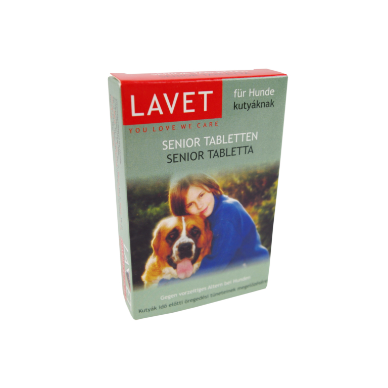 LAVET senior tablete, ki so jih razvili veterinarji, so prehranski dodatek z naravnimi, za organizem nepogrešljivimi sestavinami. LAVET SENIOR tablete za pse se proizvajajo kot kombinacija farmakoloških znanj in prehranskih sestavin, ki združuje visoke biološke vrednosti naravnih sestavin mleka in kvasa ter veliko število dodatnih vitaminov in mikroelementov, ki zagotavljajo optimalno prehrano za vašega hišnega ljubljenčka. Življenjsko pomembni vitamini in mikroelementi aromatiziranega multivitamina z algami ter dragocene mlečne in kvasne beljakovine v izdelku, spodbujajo preprečevanje prezgodnjega staranja starejših živali, povečujejo odpornost na bolezni, vitalnost ter sijaj dlake.Parameter Vsebnost aktivnih snovi v eni tableti:vitamin A 800 IEvitamin D3 3,0 IEvitamin B1 0,5 mgvitamin B2 0,5 mgnikotinamid 0,5 mgkalcijev pantotenat 1 mgvitamin B6 0,5 mgmetionin 1,1 %železo 2 mgcink 0,5 mgsurove beljakovine 11,5%surove maščobe 1,0%surove vlaknine 0,7%vsebnost vlage < 10 %vsebnost pepela 5,5%Način uporabe:Skozi usta (peroralna aplikacija).Predlagano odmerjanje:Splošni odmerek: 1 tableta / 10 kg teže / danPriporočljivo je, da se pripravek uporablja več tednov. Psi običajno radi pojejo aromatizirane tablete.Če žival iz neznanega razloga tablete ne želi pojesti, je priporočljivo, da ji zmešate jo v hrano.Pakiranje:50 tablet v vrečki PE, v kartonasti škatlici.Shranjevanje, skladiščenje:Shranjevati na sobni temperaturi (od 15 C do 25C) izven dosega otrok.