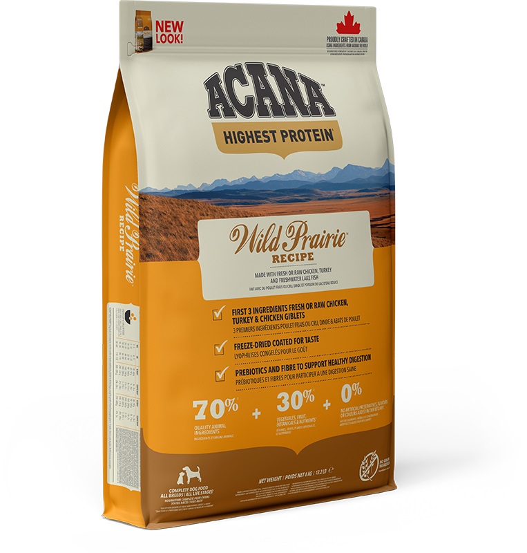 Provinca Albera je znana po svoji obsežnih ravninskih delih, kanadčani ga imeujejo kot prerijska država. V tej neskončni površini v rančih se ukvarjajo s kmetijstvom. Na severu province v hladnih in čistih jezerih živijo na stotine različne vrste ribe. Odlični naravni pogoji, temeljijo na razvoju Acana Wild Prairie. Kakovost hrane določajo kakovost in količine beljakovine in maščobe; svobodno gojeni Cobb piščanec in puran, ter jajce iz običajnih pogojev, in divji ujeti razrokost zagotavlja pravo kakovost in raznolikost. Osnovne surovine mesa 30 % sveže prihaja v tovarno, brez zmrzovanja in ne uporabljajo konzervansov. Izdelki brez žit, oziroma z nizko vsebnostjo ogljikovih hidratov vsebujejo veliko zelenjave, sadja in zelišča. Mesno hrano zdrave rastline naredijo popolno, ker oskrbujejo telo z biološko aktivnimi vitamini, z elementi in z različnimi fitonutrientinimi sledeh. 8% predelanih rastlin sveže prihaja, iz doline Okanagan ki je v Britanski Kolumbiji. 38 %-ov uporabne surovine so sveže, to pomeni, da je stopnja predelave hrane nizka, dragocena hranila se ne poškodujejo, zato jih organizem bolj učinkovito porabi. V izdelku pomemben delež ogljikovih hidratov (grah, fižol, rdeča leča) je glikemični indeks nizek. Burbank krompir mleto in ne v prahu posušeno prihaja, zato se v zmernem tempu postavlja raven sladkorja v krvi. Acana Wild Prairie je popolna vrednostna suha hrana, ki ima nizko glikemično obremenitev, kot hrane ki vsebujejo žite. Ta definira vpliv hrane na zdravje; na kakšno količino naklonja trebušno slinavko k tvorjenju insulina. Izdelek je narejen izključno v naši nagrajeni tovarni v provinci Albera v Kanadi. Kakovost uporabne surovine, razmerje makrohranilnih snovi in nizka glikemična obremenitev zagotavljajo psu sodobno in zdravo prehrano za vse starosti.Sestavine: Sveži piščanec brez kosti (19%), dehidrani piščanec (18 %), grah, dehidrirani puran (5%), olje piščančjega jetra (5%), fižol, rdeča leča, sveži burbank krompir, sveži puran brez kosti (3%), sveže celo jajce (3%), sveži razrokost brez kosti (3%), lucerna sušena na soncu, vlaken graha, sveže piščančja jetra (2%), olje slanika (2%), sveža jabolka, sveža hruška, sveži sladki krompir, sveža buča, sveža mošust buča, sveži pastinak, sveže korenje, sveža špinača, brusnica, borovnica, alge, koren cikorije, brinova jagoda, koren agelike, ognjič, koromač, list poprove mete, sivka, rožmarin, dodatki vitamine A, dodatki vitamine D3, dodatki vitamine E, niacin, riboflavin, folna kislina, biotin, dodatki vitamine B12, cinkov-proteinat, železov-proteinat, manganov-proteinat, bakrov-proteinat, seleni kvas, posušeni Enterococcus faecium produkt fermentacije.ACANA je narejena iz naravnih svežih surovinah, zato oblike in barve zrnce se lahko razlikujejo!Porazdelitev kalorije: Metabolična energija 3615 kcal/kg, ali 434 kcal poševnica 250 ml-ski kozarec; energija nastane iz 30 odstotkov beljakovine, 40 odstotkov maščobe, 30 odstotkov sadja, zelenjave in iz ovsen.Neprekinjeno je potrebno zagotoviti svežo pitno vodo. Redno očistite in razkužite posode, ki jih živali uporabljajo! Širjenje patogenov na površini pribora lahko povzročijo zdravstvene težave.Zelišča: Koren cikorije 700 mg / kgLicorica 500 mg / kgKoren angelike 350 mg / kgTriplata 350 mg / kgOgnjič 350 mg / kgKoromač 300 mg / kgList poprove mete 300 mg / kgKamilica 300 mg / kgSivka 150 mg / kgŠetraj 150 mg / kgMinerali: Natrij 0,40 %Klorid 0,50 %Kalij 0,75 %Magnezij 0,1 %Železo 180 mg/kgCink 175 mg/kgBaker 17 mg/kgMangan 16 mg/kgJod 1,8 mg/kgSelen 1,0 mg/kgAminokisline: Lizin 2,8 %Treonin 1,6 %Metionin 0,8 %Izoleucin 1,5 %Leucin 2,9 %Valin 1,9 %Arginin 2,4 %Fenilanalin 1,6 %Histidin 0,9 %Triptofan 0,3 %Cistin 0,3 %Tirozin 1,0 %Taurin 0,2 %Vitamini: Vitamin A 21 000 NE/kgVitamin D3 1 100 NE/kgVitamin E 320 NE/kgVitamin B1 (tiamin) 82 mg/kgVitamin B2 (riboflavin) 40 mg/kgVitamin B3 (niacin) 270 mg/kgVitamin B5 (pantotena ksilina) 42 mg/kgVitamin B6 (piridoxin) 30 mg/kgVitamin B12 (cianokobalamin) 0,2 mg/kgBiotin 0,8 mg/kgFolna kislina 4,0 mg/kgKolin 2 000 mg/kg