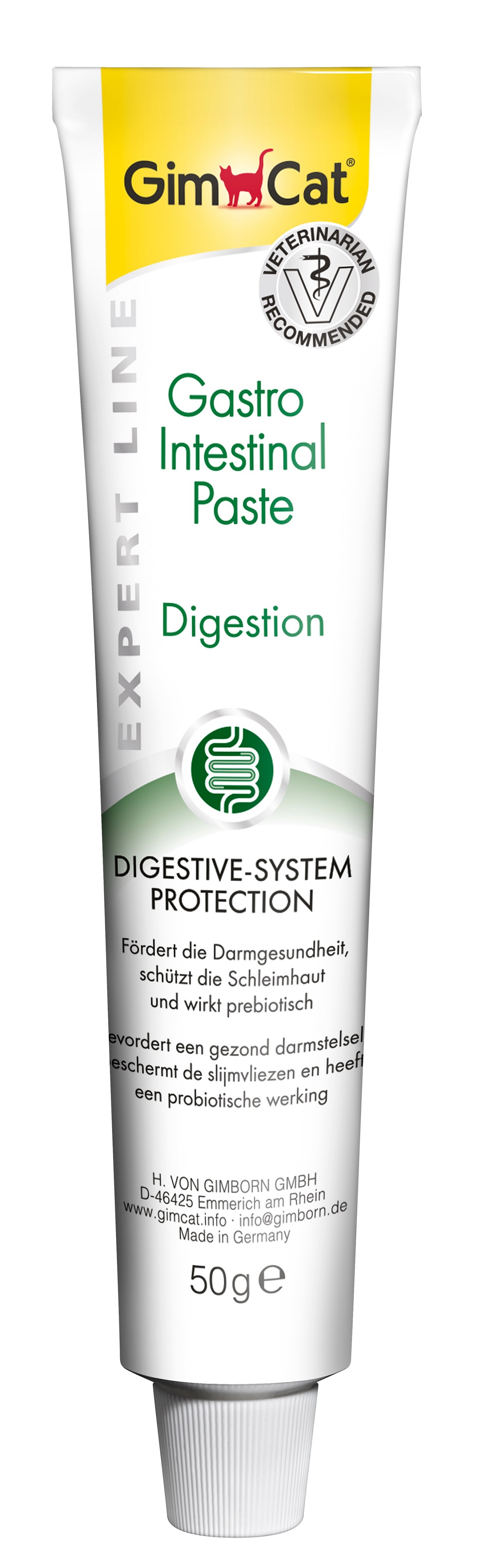 Značilnosti:GimCat Gastro Intestinal Pasta nudi prebavni poti naravno zaščito. Nešteto bakterij uravnava premike v zdravem črevesnem traktu. Vsebuje topna vlakna iz psylliumove luske in prebiotik TGOS za uravnavanje črevesja, da ohranijo dobro zdravje in črevesno floro. Beta-glukan in limova lubja pomagajo zmanjšati draženja v prebavnem traktu in zagotavljajo zdravo črevesno sluznico. Posušena trava spodbuja zdravo prebavo.Brez konzervansovBrez ojačevalcev okusaBrez sintetičnih barvilSestavine:Derivati rastlinskega izvora (psyllium, 5%; lubje mletega bremena, 2%), olja in maščobe, travni prah (5%), kvasovke (vsebuje 1% beta-glukana), laktozni derivat s TGOS * (3%). * Trans-galaktooligosaharid iz derivata laktozeBeljakovine 5,0%, vsebnost maščob 37,5%, Surov pepel 5,5%, Surova vlakna 2,0%, Vlaga 12,0%