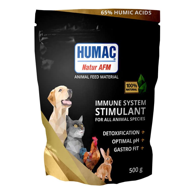 Opis:HUMAC Natur AFM Naravna snov, ki s svojim visokim deležem huminske kisline zaradi vpliva na črevesno floro in imunski sistem pozitivno vpliva na presnovne procese v živih organizmih, optimira pH prebavnega sistema.HUMAC Natur AFM je rjavkasto-črni prašek, pridobljen iz oksihulola / Leonardita - to je snov, ki je bila proizvedena z naravnim humifikacijo prazgodovinskih materialov iz rastlin. Zaradi tehnološke obdelave je količina huminskih kislin v suhi snovi višja od 65% z aktiviranjem surovine.HUMAC Natur AFM je 100% naravni material, ki zaradi svoje edinstvene tehnologije ne deluje kot sol in ima zato visoko biološko učinkovitost. Lahko se daje vsem živalskim vrstam, pomešanim z majhnimi količinami krme. Z njegovo uporabo se v telo živali v obliki kelatov vnesejo minerali in elementi v sledovih, kjer se zlahka uporabijo na ta način.Delovanje HUMAC Natur AFM:Zmešano s hrano, lahko ohranja ravnotežje mikroflore črevesja, tako da preprečuje rast škodljive mikroflore na eni strani in povečuje uporabno mikrofloro na drugi strani. Ugodno vpliva na izločanje strupenih kovin, tujih snovi, toksinov in drugih strupenih snovi v telo iz prebavnega trakta, ki telo prepušča živalskim iztrebkom. Ugodno vpliva na pH vrednost prebavnega sistema, izkoriščanje hrane in hranilnih snovi, ki jih vsebuje, kar lahko izboljša hranilno vrednost hrane.Z absorpcijo plinastih, predvsem dušikovih in drugih materialov, izboljšuje mikroklimo okolja, kar povzroča znatno zmanjšanje emisij škodljivih in vonjavnih plinov.Odmerjanje:Perutnina, zajci: 40-70 g na 10kg hrane (0,5% v krmni mešanici)Psi in mačke: 2,0-3,0 g / kos, enkrat na dan ga lahko primešamo v porcijo hrane.Majhni hišni ljubljenčki (hrček, morski prašiček): 400-500 mg na 1 kg telesne teže.Čas primešanja: 7-20 dniza majhne hišne ljubljenčke: minimalno na 5 dniUčinki:Ima humoralni imunostimulacijski učinek100% naravni materialMinerali so v kelirani oblikiUgodno vpliva na ravnovesje črevesne floreZavira absorpcijo toksinovPodpira izločanje strupenih spojin v teloPozitivno vpliva na pH prebavnega sistemaIzboljšanje uporabe hrane in hranilIzboljšuje mikroklimo živalskega okoljaNenehno čisti in razstruplja teloZamenja potrebne mikroelemente