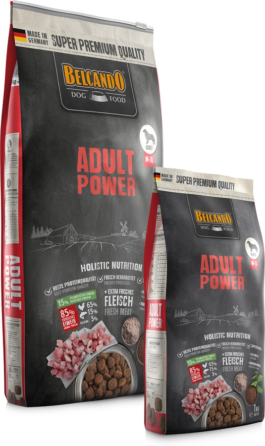 Značilnosti:Zahvaljujoč skrbno izbranim sestavinam, veliki količini lahko prebavljive perutnine in sledov, ki predstavljajo izvor beljakovin visoke biološke vrednosti, ter specialnim maščobnim kislinam omega 3 je BELCANDO ATULT POWER optimalna hrana za pse pod veliko obremenitvijo. Hladno stisnjena moka grozdnih semen poskrbi za optimalno varstvo celic.Posebno visoka vsebnost beljakovin in maščob je prilagojena energijskim potrebam izjemno aktivnih psov, ki pri delu, v športu in tudi prostočasnih aktivnostih dosegajo nadpovprečne rezultate. Zaradi visoke vsebnosti hranilnih snovi izdelek priporočamo tudi vzrejnim psicam v zadnjem obdobju brejosti in v obdobju dojenja. Delež živalskih beljakovin v skupni količini beljakovin:85 % (perutnina – 65 %, ribe – 15 %, hidrolizirana želatina – 5 %)Sestava:Sveža perutnina (30 %); sušene perutninske beljakovine z manj pepela (21 %); koruza; riž; ribja moka iz morskih rib (6 %); perutninska maščoba; rastlinska olja (palmovo, kokosovo); sušena cela jajca (2,5 %); hidrolizirana želatina (2,5 %); razoljena grozdna smena (2,5 %); sušen pivski kvas; sušen rožič; sušeni pesni rezanci brez sladkorja; semena oljne kadulje; hidrolizirana perutninska jetra; dikalcijev fosfat; natrijev klorid; kalijev klorid; sušena zelišča (skupaj 0,2 %: koprivini listi, korenine encijana, tavžentroža, kamilica, janež, kumina, omela, navadni man, borovničevi listi); juka Mojave.