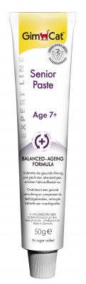 Lastnosti:GimCat Senior Paste je bil razvit za potrebe starejših mačk (starih od 7 let). Formula vključuje: 1. Hidrolizirane beljakovine bele ribe za optimalno prebavo 2. L-karnitin in kompleks vitamina B za izboljšanje metabolizma 3. Beta-glukan za izboljšanje imunske zaščite 4. Glukozamin spodbuja gibljivost sklepov 5. L-triptofan za spodbujanje proizvodnje serotonina (hormoni sreče) Sestavine: Rastlinski derivati, olja in maščobe, ribe in njihovi derivati (beljakovinski koncentrat belih rib 5%), kvasovke (1% beta-glukan), mehkužci in raki (N-acetilglukozamin 0,42%). Priporočilo za odmerjanje: Odprite 6 cm na dan (1 cm = približno 0,5 g), lahko jih dajete neposredno ali s hrano. Po odprtju shranjujte na hladnem.