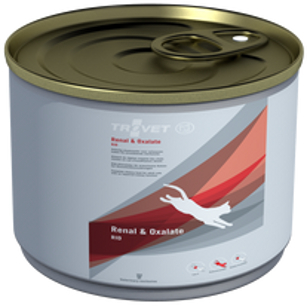 TROVET Renal & Oxalate Diet (RID) - popolna hrana v konzervi je razvita za mačke z boleznimi ledvic. Glavni nalogi ledvic sta funkciji filtriranja in izločanja pri kateri iz krvi filtrira in odstranjuje odpadne snovi (razgradnja beljakovin in fosfatov). Katere postanejo nepotrebne in škodljive za telo, ter zadržujejo pomembne vitamine in mineralne soli. Če je funkcija izločanja poškodovana ali zaustavljena ta vodi v zastrupitev telesa. Če je funkcija filtra poškodovana, telo izgubi pomembne soli in hranila ter tekočino. Simptomi hude okvare ledvic se pojavijo šele, ko je poškodovanih več kot 75% ledvic. Ob pojavu prvih simptomov (povečano uživanje tekočine) se čim prej posvetujte z veterinarjem. TROVET RENAL & OXALATE razbremeni ledvice zaradi zmanjšane vsebnosti beljakovin, vendar imajo te beljakovine visoko biološko vrednost, zato pokrivajo potrebe telesa po aminokislinah. bistveno zmanjšana količina fosforja preprečuje nadaljnje poslabšanje delovanja ledvic. Količina vitaminov in mineralov je prilagojena tudi spremenjenim potrebam živali z okvarjenim delovanjem ledvic. Vsebuje kalijev citrat , ki preprečuje prekomerno zakisanje urina in s tem zavira nastajanje oksalatnih kristalov. Uporabljamo ga lahko za preprečevanje nastajanja urina , cist in oksalatov ter v vseh primerih kjer je potrebna alkalizacija urina (zniževanje pH). Vrednosti vsebine: Surove beljakovine 6%, surove maščobe 8%, surove vlaknine0,40%, surovi pepel 1,30%, kalcij 0,14%, fofor 0,008%, natrij 0,16%, kalij 0,21%, vit. 1200 IE/kg, vitamin D# 150 IE/kg, vitamin E 100mg/kg. Presnovna energija: 4,90MJ/kg