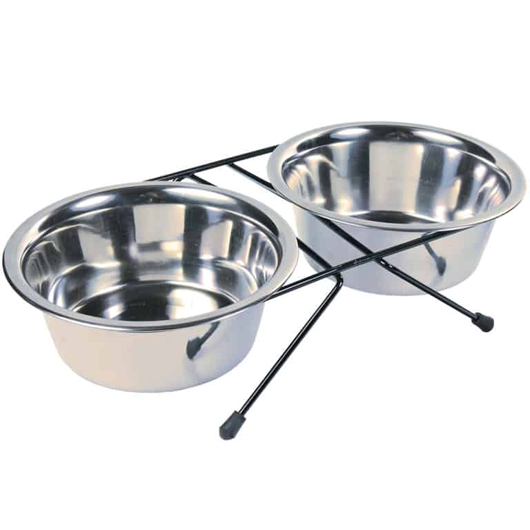 2 kosa posodi za psa z nizkim, kovinskim stojalom. Premer posode: 2,8 L - 24 cm, dejanska prostornina 2,5L1,8 L - 20 cm, dejanska prostornina 1,5L0,75 L - 15 cm, dejanska prostornina 0,5L0,45 L - 12 cm, dejanska prostornina 0,25L